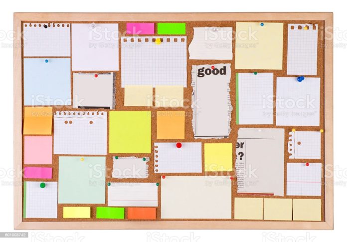 Cork notice board with many blank pieces of paper